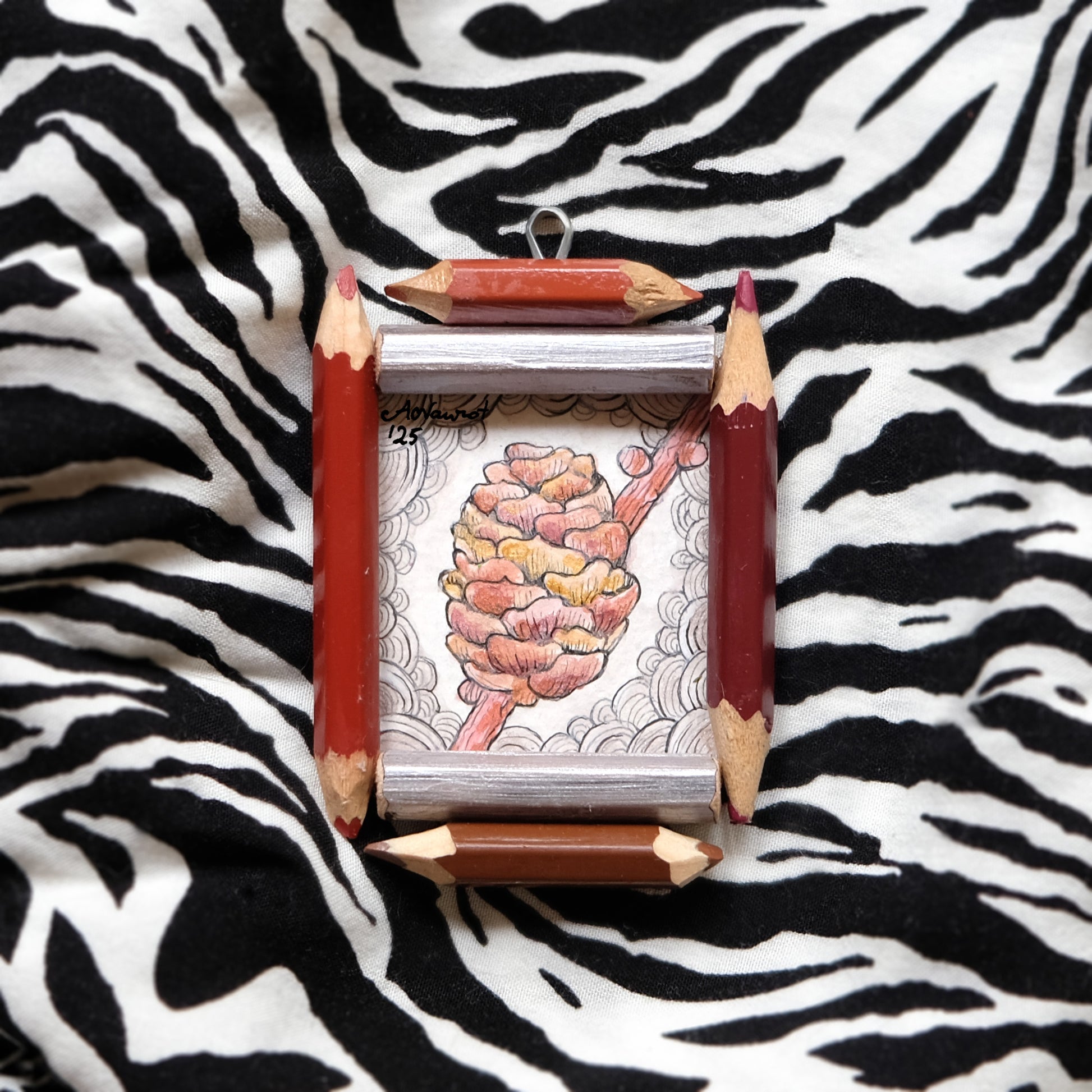Bring a spark of magic and warmth into your space with this original miniature painting - lovingly hand-drawn in ink, painted with bright acrylics (sparkling with shimmering touches of silver paint), and sealed with protective varnish. Each piece is completely unique and made to feel like a tiny window into a secret, enchanted world. The painting is framed in real colored pencils, which makes it playful and original.