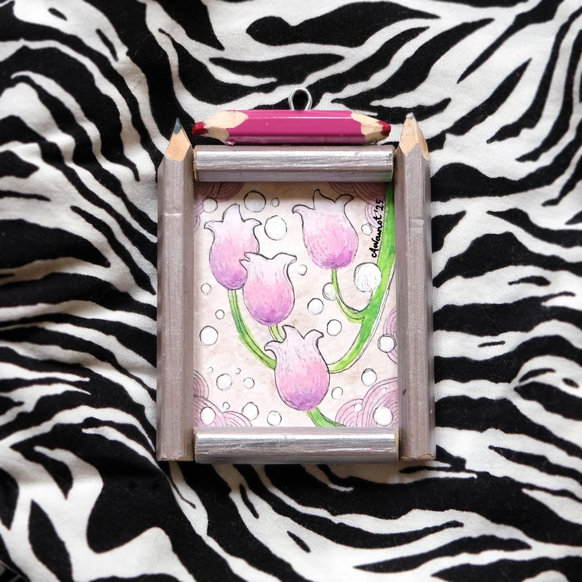 Bring a spark of magic and warmth into your space with this original miniature painting - lovingly hand-drawn in ink, painted with bright acrylics (sparkling with shimmering touches of silver paint), and sealed with protective varnish. Each piece is completely unique and made to feel like a tiny window into a secret, enchanted world. The painting is framed in real colored pencils, which makes it playful and original.