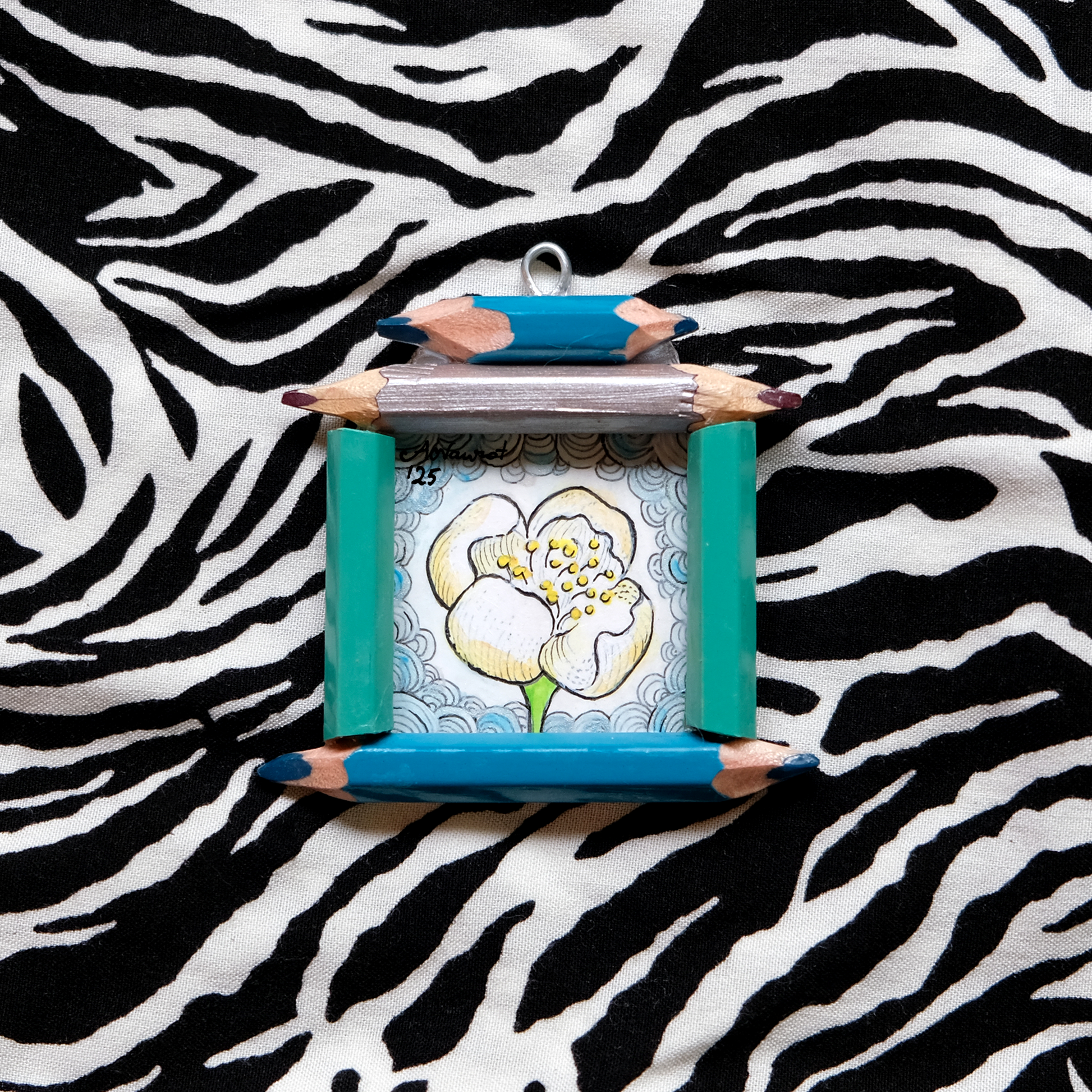 This mini painting will also look great as an original pendant filled with intention to guide you through your day. It is sturdy enough and safely secured with varnish and bookbinder glue to be safely worn, but it's still a miniature work of art, so be sure to avoid direct and heavy rain when wearing it outside. This offer does not include the chain.